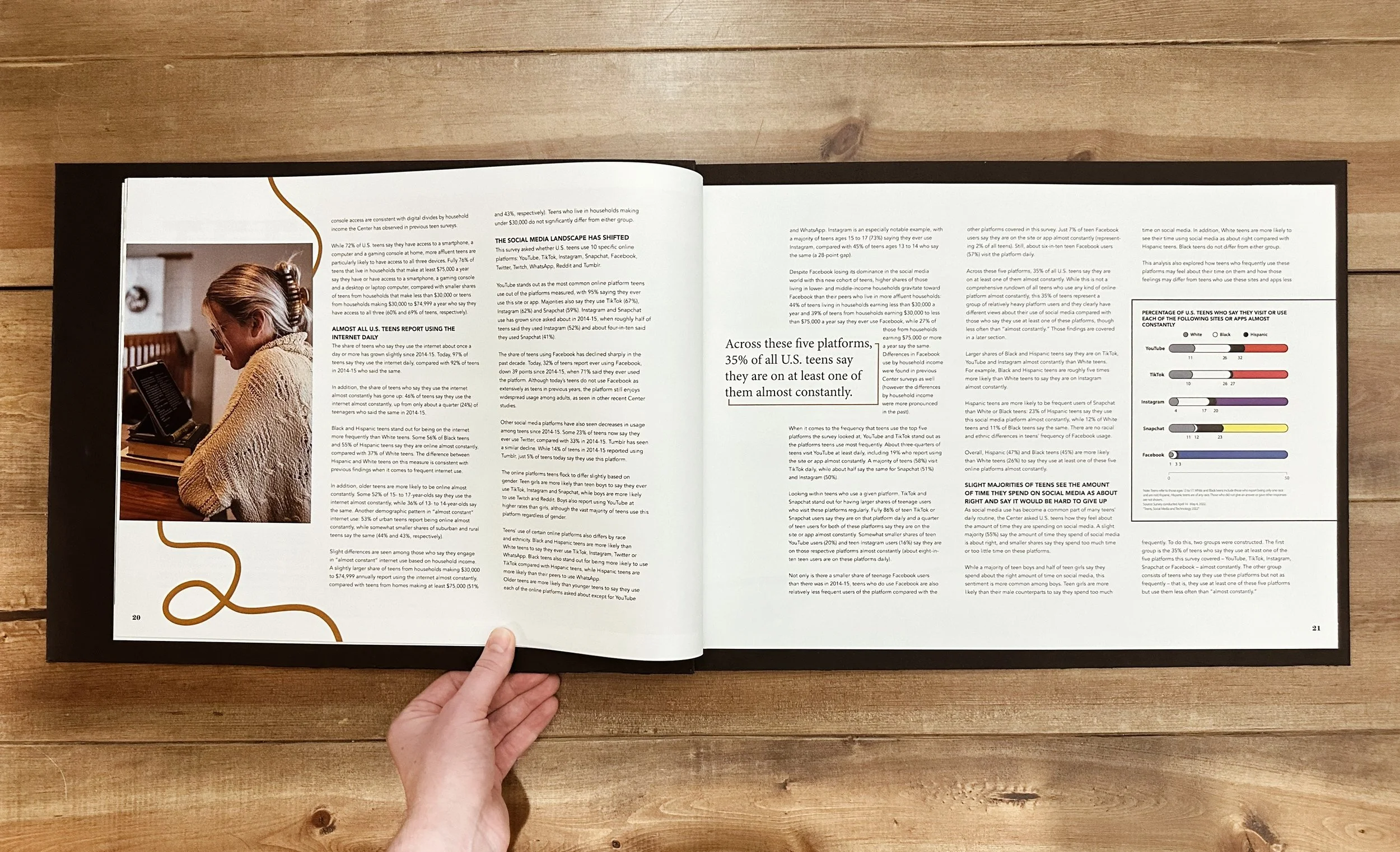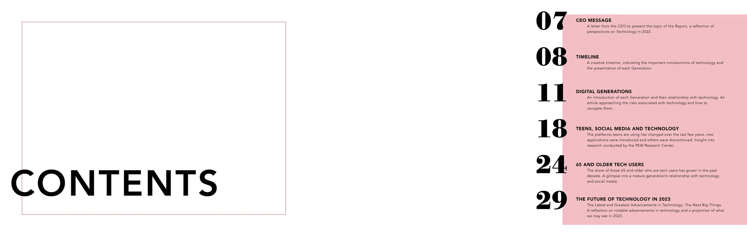 For this project, we were asked to create an Annual Report centered on a topic of our choosing. With a personal interest in psychology and generational division, I chose "Generational Perspectives of Technology" as my topic of interest. We began this process by researching our topic and collecting articles to include in our piece. Following this was asset collection and image-making. All imagery and illustrations included in this project were done by me for this project.